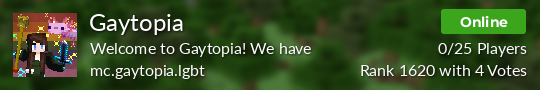 The goal of Gaytopia is to provide an enjoyable space for the LBGT+ Community to play Minecraft together.