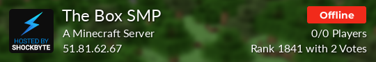 Survival multiplayer brought to you by The Box Network! Join today to enjoy a fun rewarding gameplay experience full of unique content. Climb the rank ladder and become a high ranking member which will grant you access to special perks!