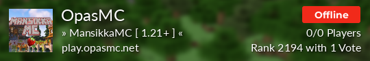Please note that the language spoken on this server is Finnish and you can join the server only from Finland. In OpasMC you can currently play Survival, CrystalPvP, Bedwars, and Spleef. In addition, there are Glide mini game and a PvP area at the hub of the server. There's also a server called "Ullakko" in OpasMC, where you can play SkyWars and Creative. You can also join the server in Bedrock Edition using play.opasmc.net and port 19132.