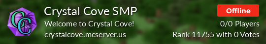 The server is open to all ages but expects mature behavior. Toxic individuals will be removed! Crystal Cove SMP has a dedicated vanilla survival world, creative, parkour, events, and an Earth SMP world coming soon.